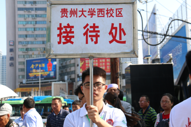 带路的小伙伴是最需要谨慎的,因为贵阳火车站附近路况复杂,人流量大,一不小心就容易走散,所以通常都是由至少三个以上的志愿者同学,一前一中一后的引领,才把新生队伍带到乘车地点。途中需要穿过一条斑马线、一段窄而长的护栏、一个公交车聚集的公交站牌群、一个空旷的体育馆广场。