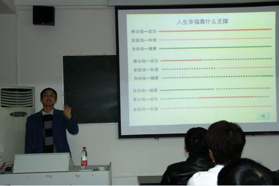 担任这次培训的讲师为土建学院的指导员燕超和心理导师杨戈。首先发言的燕超指导员抛出了梦想与职业关系的问题。他指出:在现实中,人们往往需要用职业去养活梦想,并举出了作家阿毅的例子,就此引出了大学生们必须要突破限制的观点。并通过一名右手残疾的老师在全国指导员技能大赛上获得一等奖的事例来激励我们,鼓励我们要勇于承认自己,突破自身极限。