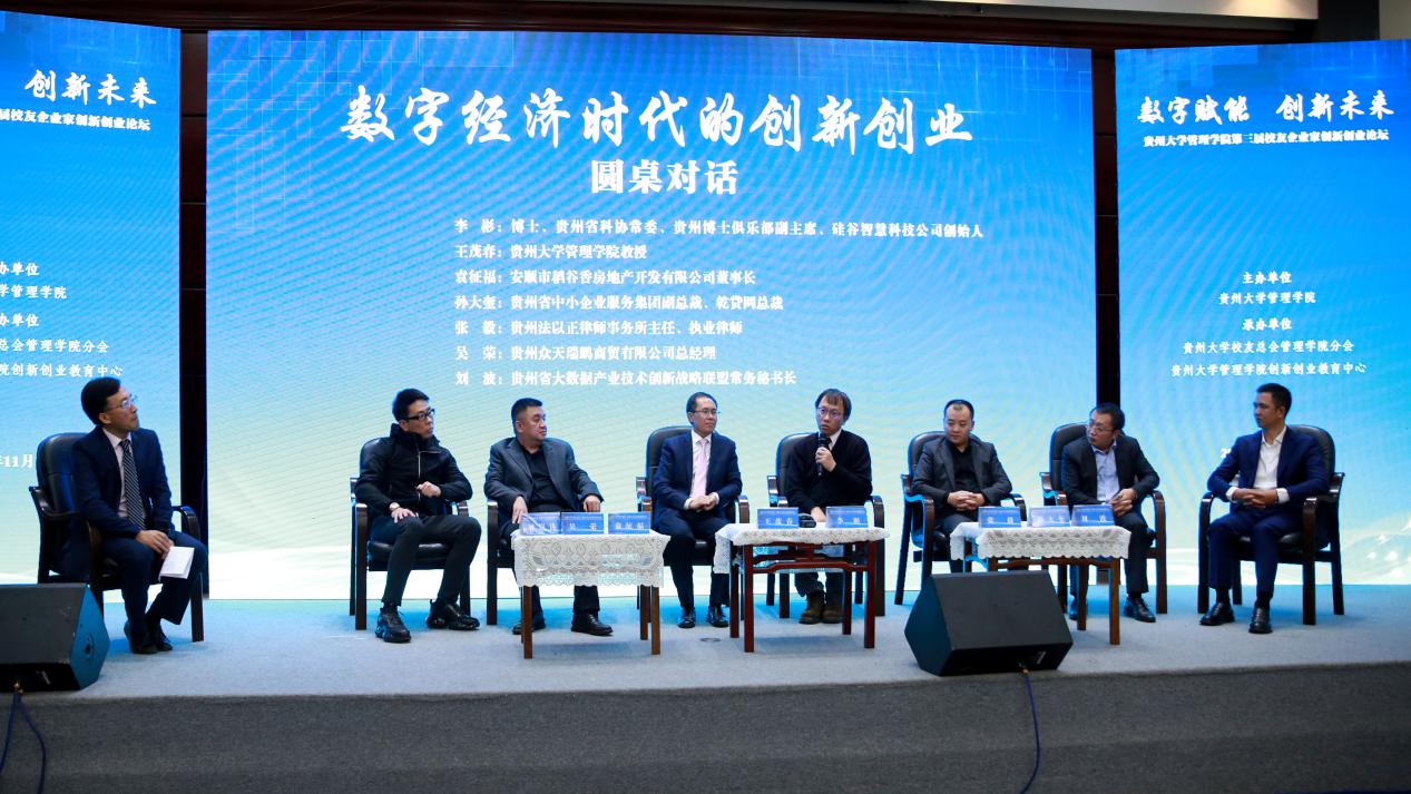 论坛上贵州省科协常委、贵州博士俱乐部副主席、硅谷智慧科技公司创始人李彬博士、350vip8888新葡的京集团教授王茂春,安顺市稻谷香房地产开发有限公司董事长袁征福,贵州省中小企业服务集团副总裁、乾贷网总裁孙大奎,贵州法以正律师事务所主任、执业律师张毅,贵州众天瑞鹏商贸有限公司总经理吴荣,贵州省大数据产业技术创新战略联盟常务秘书长刘波7位嘉宾以“数字经济时代的创新创业”为主题进行圆桌对话,展开激烈的思想交锋,分享了各自的观点和看法。