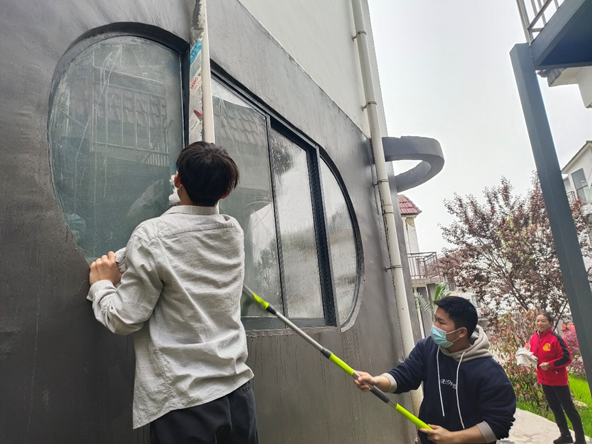 进入养老公寓后,公寓负责人向大家介绍了公寓的具体情况以及今天的任务。在工作人员的指导安排下,女同学们被分成若干小组来整理老人衣物、打扫房间卫生,男同学们则在一楼擦拭室外玻璃。在打扫过程中,同学们各司其职,用实际行动来表达自己爱心。