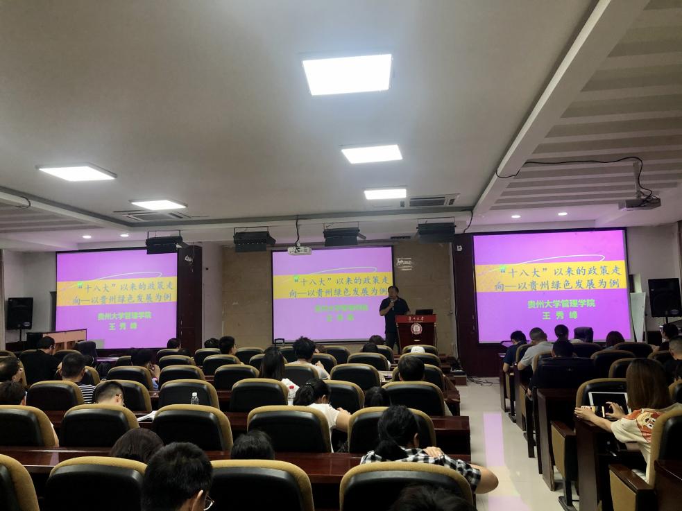 王秀峰围绕绿色发展背景、理论与实践、贵州经济绿色发展水平测度、贵州经济绿色发展环境条件、贵州绿色经济发展战略方案和发展的路径与保障体系构建等方面并通过贵州省与全国省均绿色化、工业固体废物产生量和林业投资额相比和湄潭县七彩部落的创意农业等案例,为大家讲述了党的十八大以来贵州翻天覆地的变化史,展示了贵州省在生态文明建设上取得的成就,展现了贵州省产业发展绿色化水平。