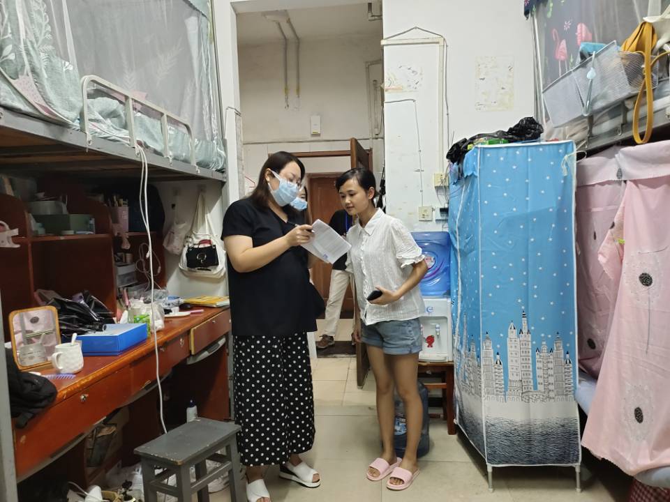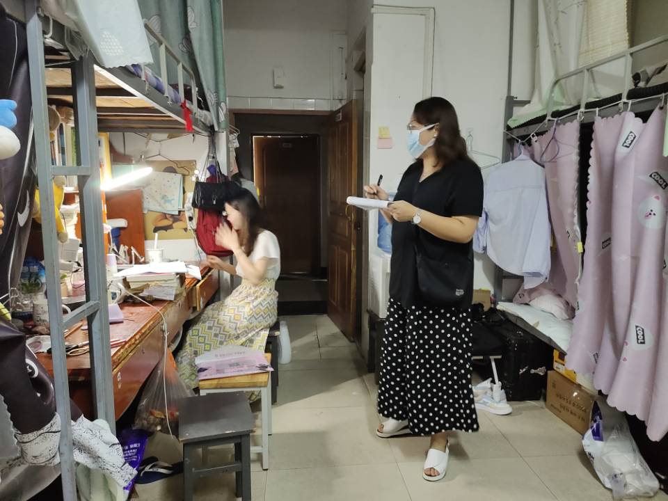 在疫情特殊时期,三位老师在走访过程中关切地询问了学生返校情况,确认有无从中高风险地区返校的同学及外宿情况,同时检查了寝室设施的完整情况,并嘱托同学们在宿舍设施出现故障和损坏时要及时报修。
