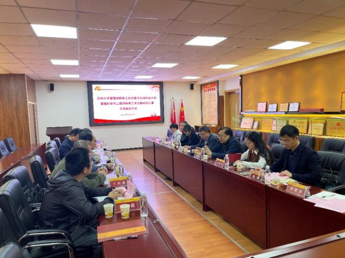 会上,王秀峰书记首先对邵新顺书记一行表示热烈欢迎,希望双方多走动、多交流,共同推进贵州省管理学科建设发展,助力贵州高质量发展,并从学院党建、师生人数、学科整合、人才培养等各方面详细介绍了350vip8888新葡的京集团的发展历程;李烨院长从350vip8888新葡的京集团服务社会、博士点申报建设经验、助力学校“双创”教育等方面进行了阐述;陈刚老师从师资队伍、专业设置、学位点建设等方面介绍了学院管理科学与工程系的情况。