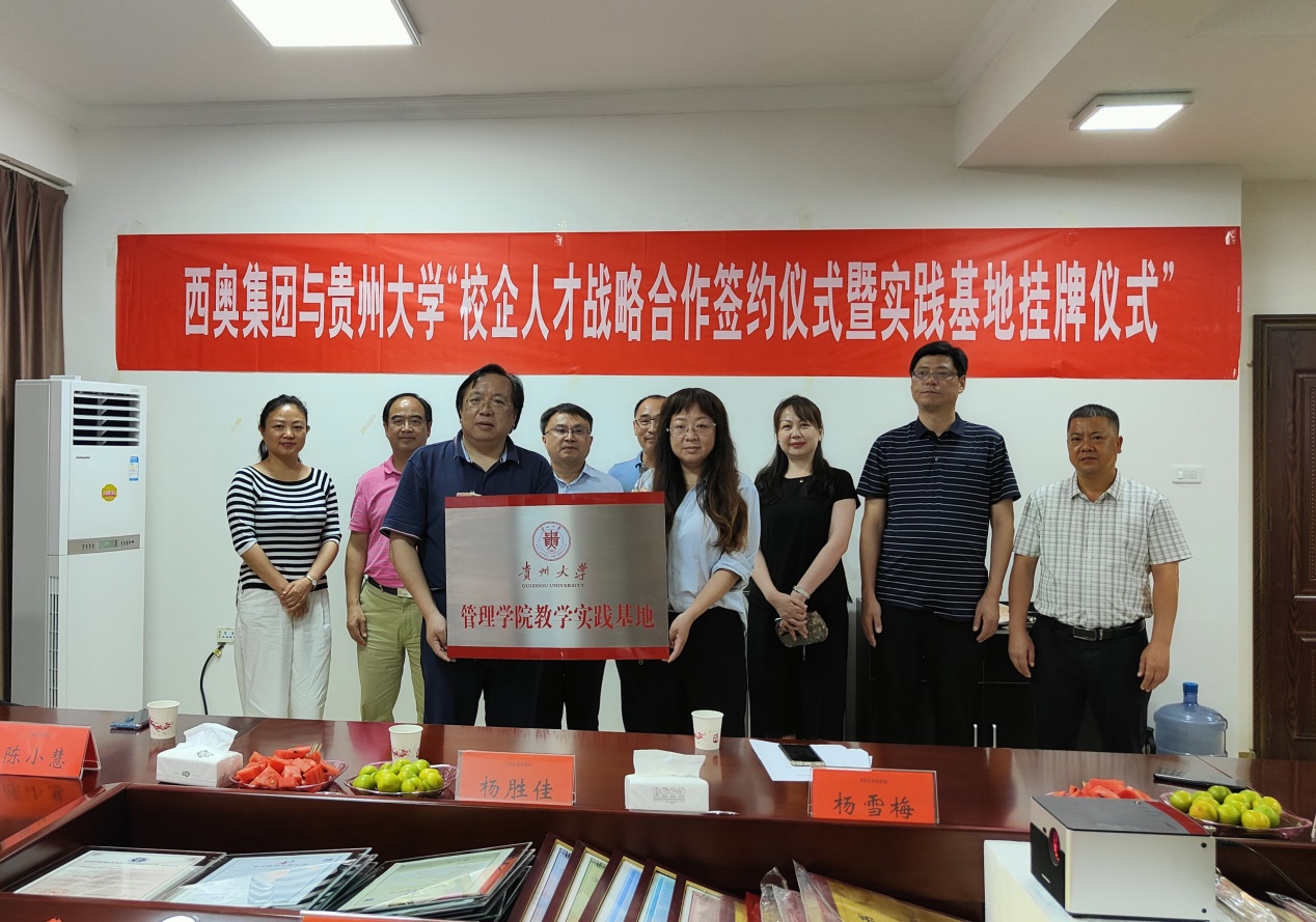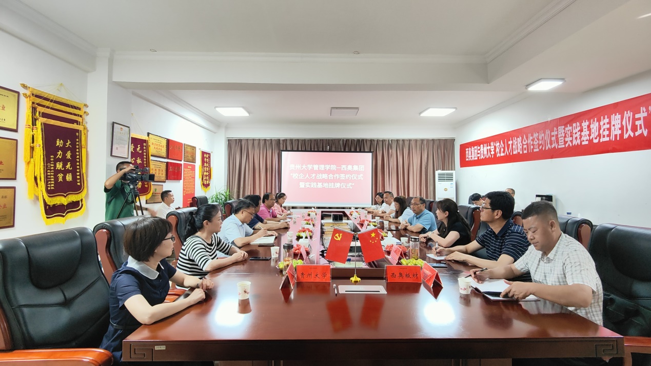 2022年7月5日,350vip8888新葡的京集团党委书记王秀峰、院长李烨、副院长罗敏、副书记洪影秋及相关科室负责人赴西奥集团长顺生产基地与该公司签署了人才战略合作协议并举行了实践基地挂牌仪式,长顺县人民政府党组成员刘隽、政协副主席周坤出席了此次活动,园区管委会主任杨尚勇、西奥集团董事长杨景龙先生及公司相关负责人全程参与了签约和挂牌仪式。
