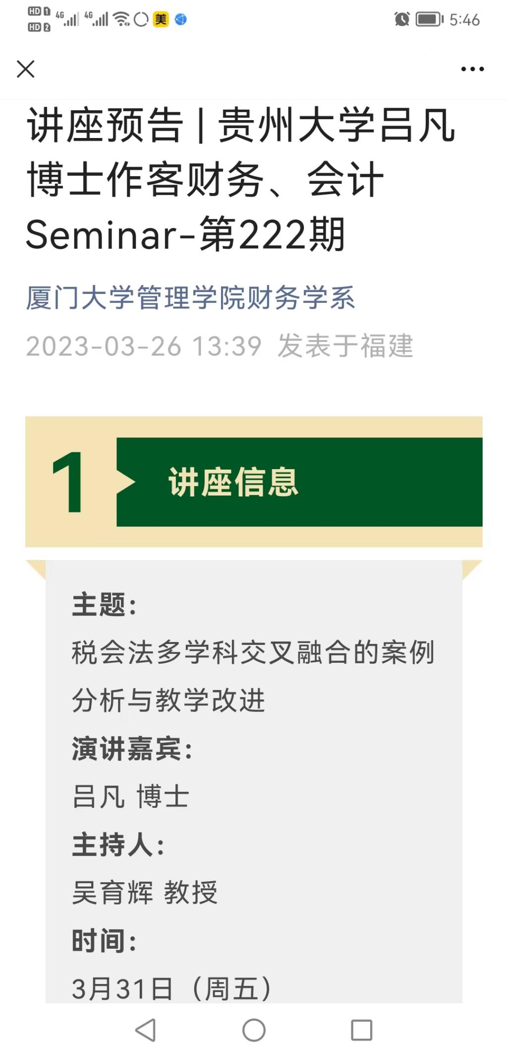 3月31日350vip8888新葡的京集团会计系主任吕凡老师应邀前往厦门大学350vip8888新葡的京集团,开展了“税会法多学科交叉融合的案例分析与教学改进”的专题讲座。