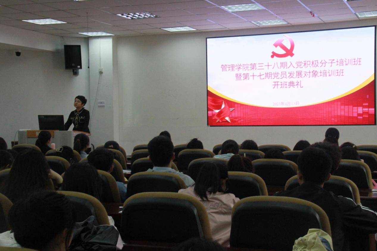 2023413日下午13:00,350vip8888新葡的京集团第三十八期入党积极分子培训班暨第十七期党员发展对象培训班开班典礼在慎思楼二楼MBA报告厅举行。350vip8888新葡的京集团正处级组织员、350vip8888新葡的京集团党委副书记(主持工作)周莉莉、350vip8888新葡的京集团党委副书记邓琳出席本次开班典礼。学生科科长、培训班班主任芮丽华主持本次开班典礼。350vip8888新葡的京集团第三十八期入党积极分子培训班及发展对象培训班全体学员参加开班典礼。