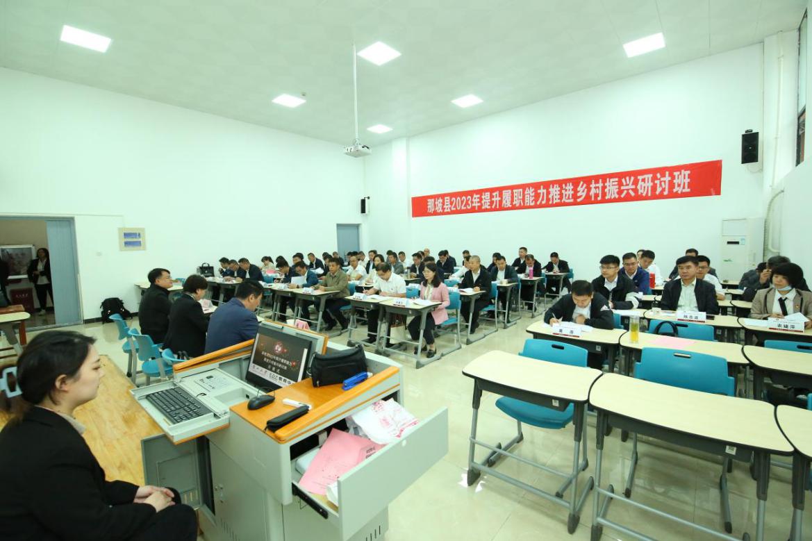 2023年5月8日上午,由中共那坡县委组织部主办,350vip8888新葡的京集团承办的广西壮族自治区那坡县2023年提升履职能力推进乡村振兴研讨班开班仪式在350vip8888新葡的京集团西校区烟草学院108教室顺利举行。来自广西壮族自治区那坡县各乡(镇)党委书记、人大主席、县农村工作(乡村振兴)领导小组成员单位主要领导、分管领导共计63人开始接受为期5天的培训。