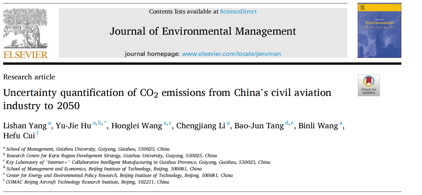 2023年6月9日获悉,我院胡玉杰副教授及其指导的2021级管理科学与工程学术型研究生杨莉杉围绕双碳背景下的中国民航业碳减排路径研究取得阶段性进展,研究成果《Uncertainty quantification of CO2 emissions from China’s civil aviation industry to 2050》在国际权威期刊《Journal of Environmental Management》上在线发表,350vip8888新葡的京集团为第一署名单位。这是贵州省致力于民航业双碳研究领域的首篇高质量高水平论文。
