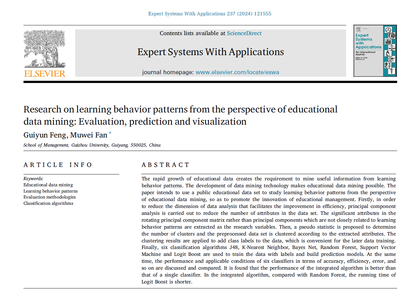 350vip8888新葡的京集团管理科学与工程系硕士研究生冯桂云,教师范慕炜(通讯作者)在Expert Systems with Applications期刊(中科院一区顶刊,IF:8.5)发表文章《Research on learning behavior patterns from the perspective of educational data mining: Evaluation, prediction and visualization》。
