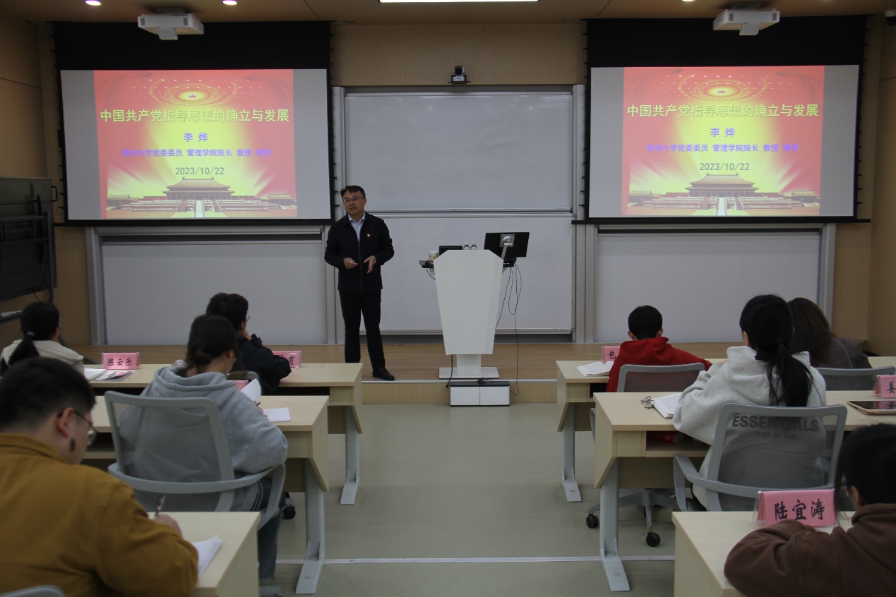 20231022日上午,350vip8888新葡的京集团第三十九期入党积极分子培训班专题党课在致远楼102教室顺利开展。本次课程由350vip8888新葡的京集团党委委员、350vip8888新葡的京集团党委副书记、院长李烨同志担任主讲人,主要内容围绕“中国共产党指导思想的确立与发展”展开。