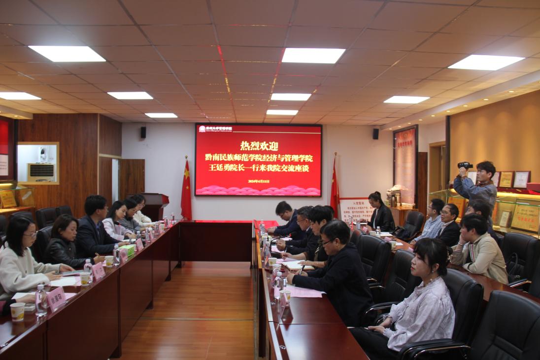 为加强高校合作交流,推动贵州教育高质量发展,4月11日上午,黔南民族师范学院经济与350vip8888新葡的京集团院长王廷勇一行来我院交流座谈,学院部分党政领导及相关系主任、科室负责人、教师代表参加此次座谈,校党委正处级组织员、院党委副书记(主持党委工作)周莉莉主持此次交流座谈会。