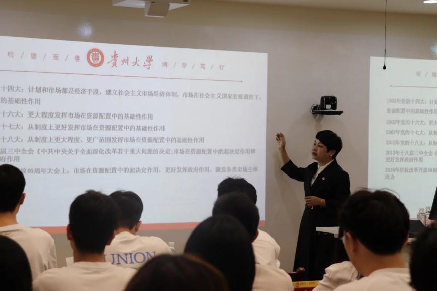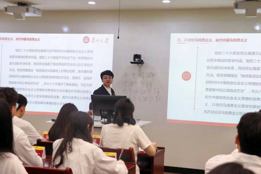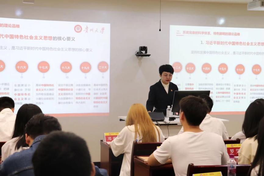随后,她讲述了习近平新时代中国特色社会主义思想是系统完备的科学体系和特色鲜明的理论品格。她强调了习近平新时代中国特色社会主义思想的核心要义——坚持和发展中国特色社会主义;讲述了习近平新时代中国特色社会主义思想的“十个明确”“14个坚持” “六个必须坚持”的内涵;强调了习近平新时代中国特色社会主义思想的理论品格:坚定的理想信念、真挚的人民情怀、高度的自觉自信、无畏的担当精神及鲜明的问题导向。