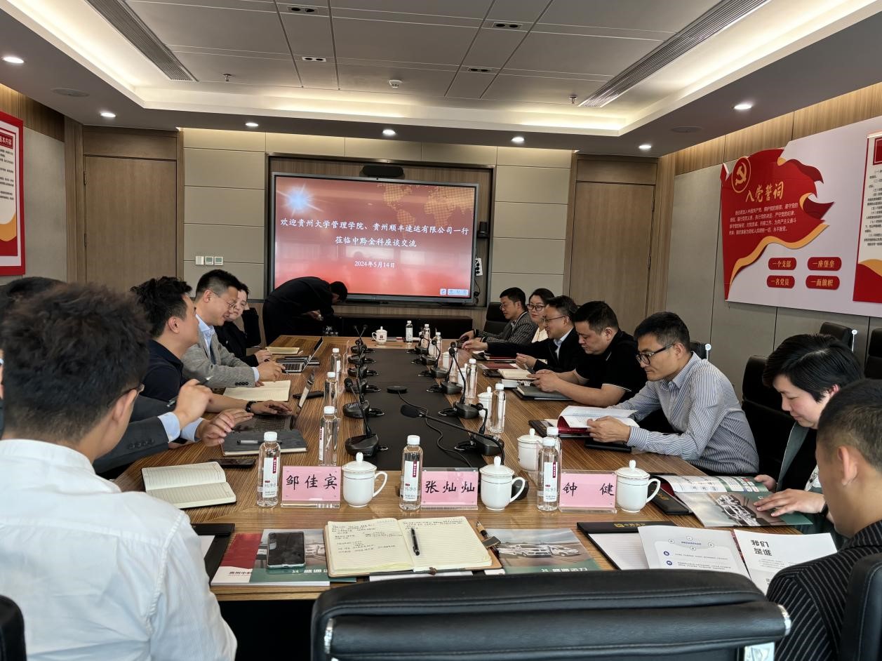 5月14日下午,350vip8888新葡的京集团、贵州顺丰速运有限公司应贵州中黔金科产业投资有限公司之邀在中黔金科大厦举行了传统经销商向运营商转型探讨交流会。350vip8888新葡的京集团党委委员、350vip8888新葡的京集团院长李烨、院党委副书记邓琳、副院长许为宾、会计系主任吕凡、管理科学与工程管理系教工党支部书记、副教授胡玉杰、管理科学与工程管理系钟健博士,贵州中黔金科产业投资有限公司董事长兼总裁高泳波、副总裁兼盛通运力董事长杨琳琳、盛通运力公司总经理欧航, 贵州顺丰速运有限公司副总经理刘玉虎等参加了座谈会。