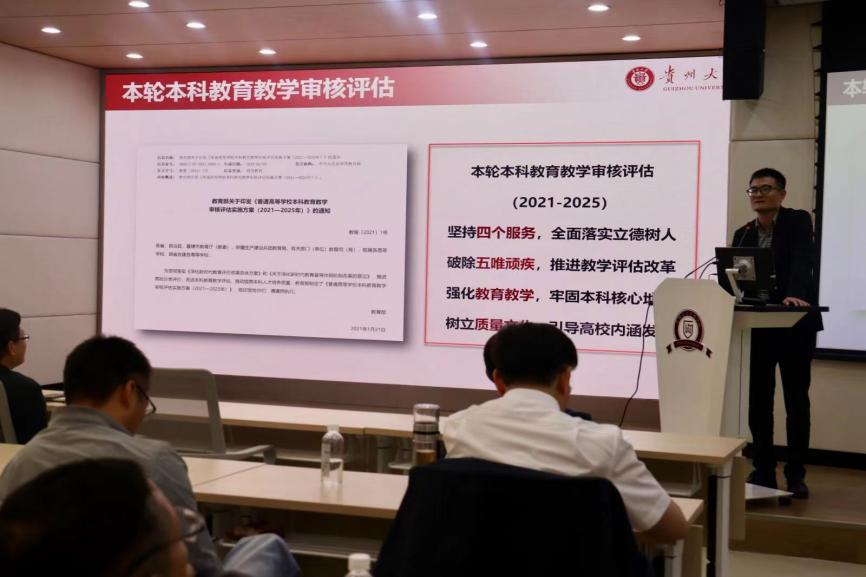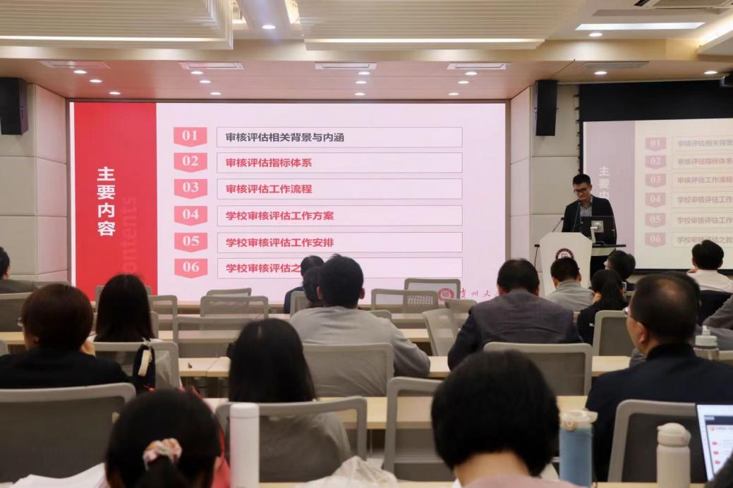 许为宾副院长以《以评促建 以评促改 以评促强 以评促管 全员全环节全力推进本科教育教学审核评估工作》为题,带领全体教职工学习本科教育教学审核评估工作相关知识,主要内容包括:审核评估相关背景与内涵、审核评估指标体系、审核评估工作流程、学校审核工作方案、学校审核评估工作安排、学校审核评估对教师的要求、350vip8888新葡的京集团审核评估工作基本情况等。