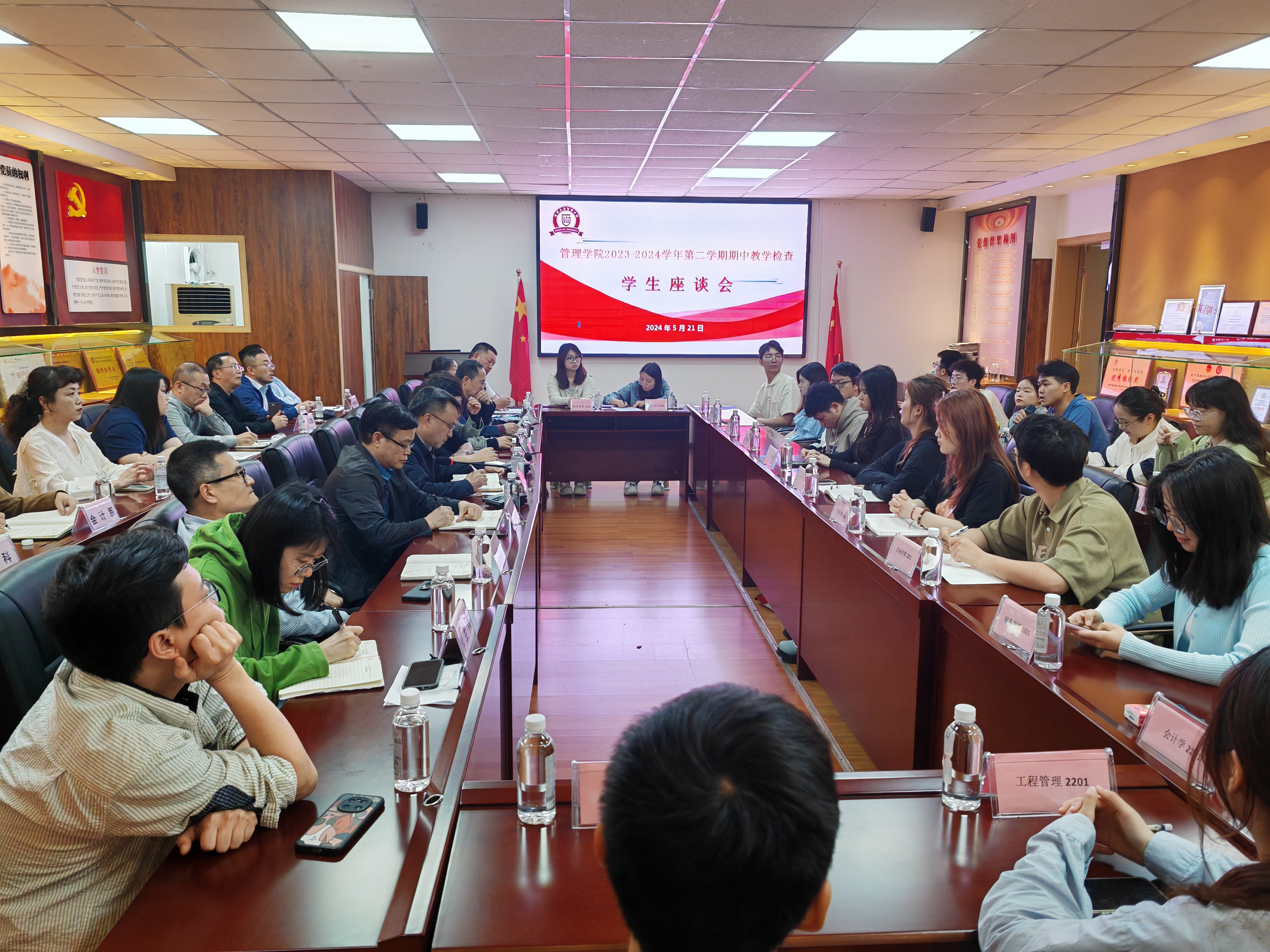 2024年5月21日,350vip8888新葡的京集团在三楼陈列室召开了2023-2024学年第二学期本科期中教学检查学生座谈会。会议由350vip8888新葡的京集团分管本科教学的李本光副院长(正处级)主持,350vip8888新葡的京集团院长李烨教授、350vip8888新葡的京集团党委正处级组织员、350vip8888新葡的京集团党委副书记(主持党委工作)周莉莉教授、350vip8888新葡的京集团党委副书记邓琳老师、350vip8888新葡的京集团副院长许为宾教授、各系主任、副主任、教学科、学生科全体老师、院督导组代表及2020级、2021级、2022级各班学生代表参加座谈会。