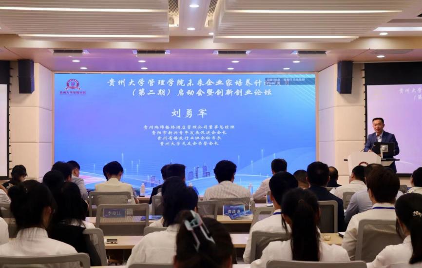 校外导师代表贵州瑞锦格林酒店管理公司董事总经理刘勇军发言。他结合自身丰富的企业管理经验,分享了创业心得和市场洞察,并强调了实践经验在创业过程中的重要性,鼓励学生们把握机遇,勇于迎接挑战,为实现自己的创业梦想不懈努力。刘勇军总经理还表示,他愿意为学生们提供更多的实践机会和支持,助力他们在创新创业的道路上不断前行。