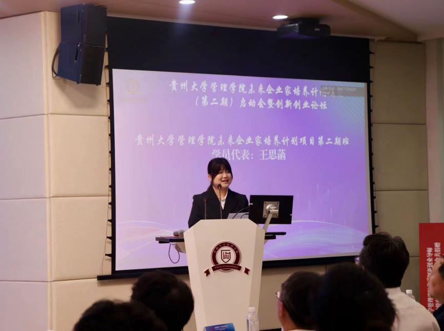 未来企业家培养计划项目第二期班学生代表王思菡发言。她表示很荣幸能成为未来企业家班第二期学员,感谢学院给予的支持,她将和同学们共同珍惜这次宝贵的机会,努力学习,不负众望。