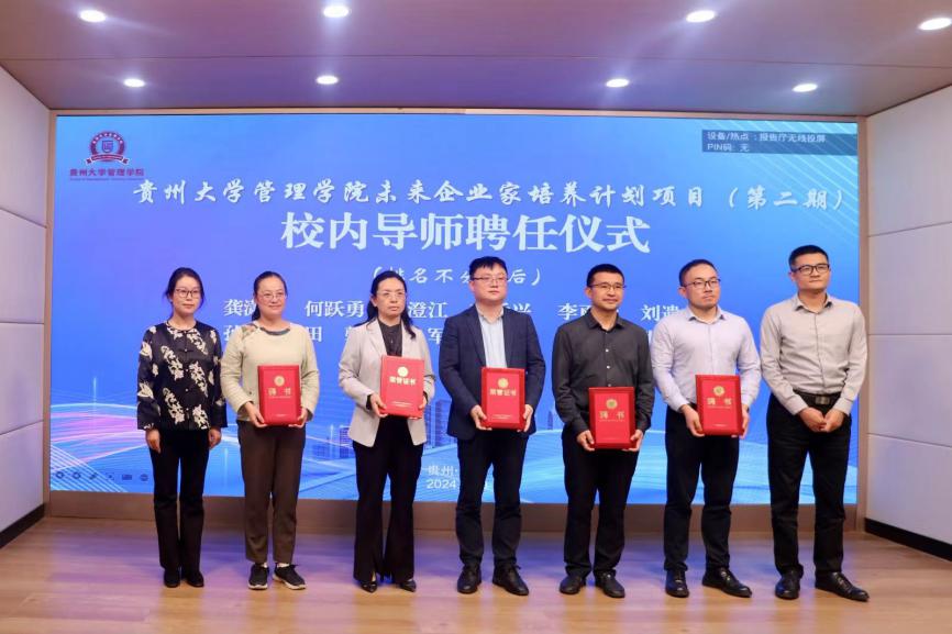 校外导师代表贵州瑞锦格林酒店管理公司董事总经理刘勇军发言。他结合自身丰富的企业管理经验,分享了创业心得和市场洞察,并强调了实践经验在创业过程中的重要性,鼓励学生们把握机遇,勇于迎接挑战,为实现自己的创业梦想不懈努力。刘勇军总经理还表示,他愿意为学生们提供更多的实践机会和支持,助力他们在创新创业的道路上不断前行。