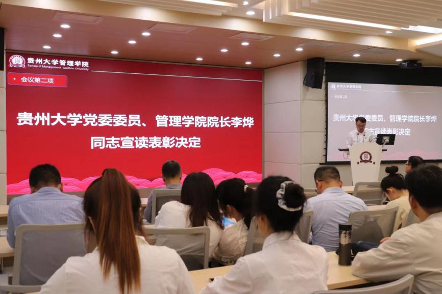 会议第二项,350vip8888新葡的京集团党委委员、350vip8888新葡的京集团院长李烨宣读表彰决定。他指出,表彰先进是为了更好地激全体党员干部奋发进取,进一步推动学院各项事业高质量发展。他号召全体党员以受到表彰的先进典型为榜样,不忘初心、牢记使命,为推动学院高质量发展作出新的更大贡献。这些先进个人中,不仅有辛勤耕耘在教育一线的党员老师,更有许多活跃在学院各个角落的党员同学。他们在推动学院高质量发展、传播“管院好声音”等方面,发挥了重要作用,为全体党员树立了榜样。