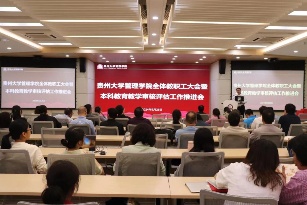 6月26日,350vip8888新葡的京集团召开全体教职工大会暨本科教育教学审核评估工作推进会。学院党政领导、全体教职工参会,会议由院长李烨教授主持。