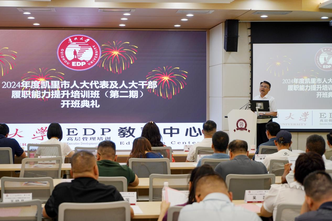 李烨院长在致辞中表示,新时代、新征程,人大代表和人大干部的角色变得更加重要。为深入学习习近平新时代中国特色社会主义思想和习近平总书记对贵州工作重要指示批示精神,认真贯彻党的二十大精神及中央、省委、州委人大工作会议精神,切实提高市人大代表、人大干部的综合素质和履职能力,凯里市人大常委会决定在我校举办本次培训班。新形势下应不断加强代表工作能力建设,为加快发展新质生产力,扎实推进高质量发展贡献人大力量。