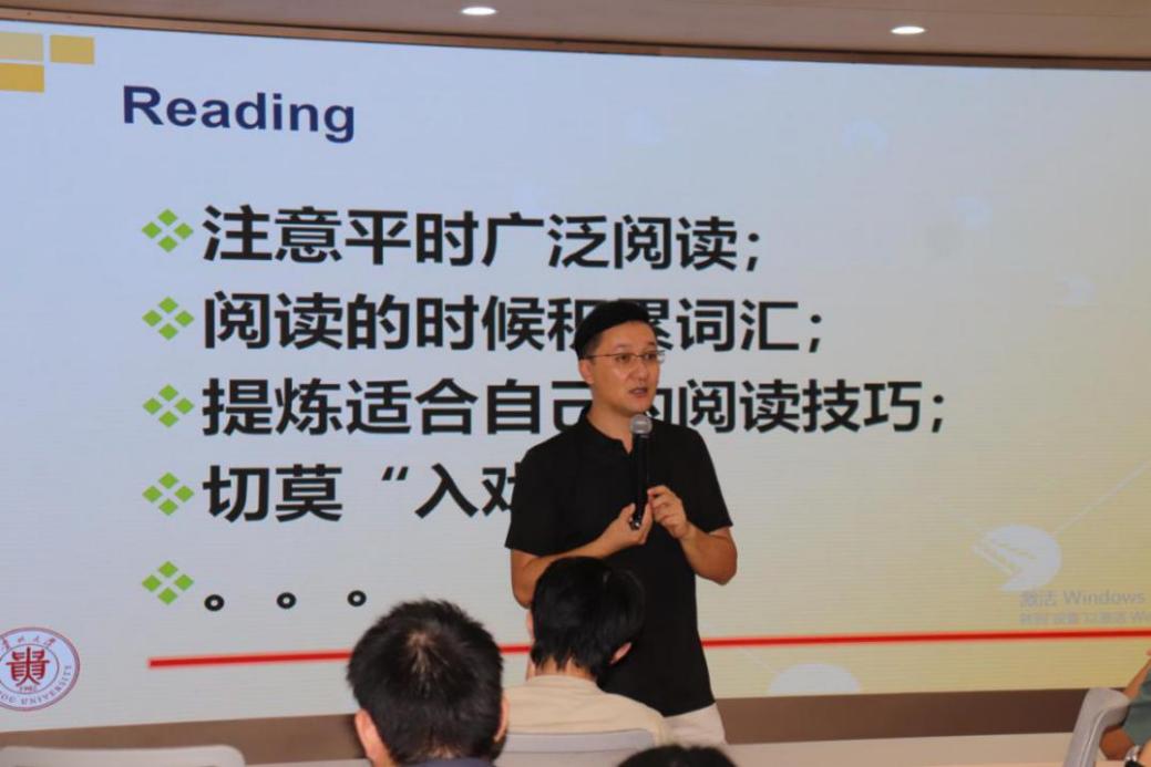 沈麟教授分为“听说训练”和“读写译训练”两大板块展开外语学习的方法。在“听说训练”板块中,沈麟教授指出同学们目前存在的三个误区,即“国外的学习环境”“从慢到快的学习语速”“昂贵的学习资源”。他强调同学们应该遵循内在的语言环境,按照日常的语速学习外语,不必追求昂贵的学习资源,端正学习态度,通过自己的努力学好外语。沈麟教授讲述自己和美国孔院(中文项目)的故事,为同学们展示他与外国学生学习交流,传播中华文化,吸引外国学生来到中国交流学习的经历。