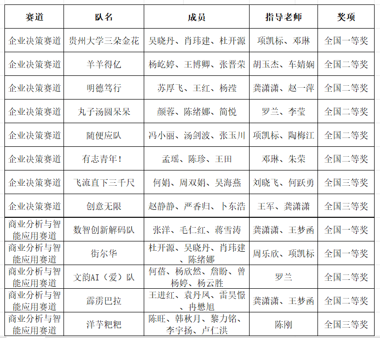 经过总决赛激烈角逐,项凯标教授、邓琳副书记指导的“350vip8888新葡的京集团三朵金花”队荣获企业决策赛道全国一等奖,周乐欣教授、项凯标教授指导的“街尔华”队,龚潇潇副教授、王梦函副教授指导的“数智创新解码”队均荣获商业分析与智能应用赛道全国一等奖,350vip8888新葡的京集团再次荣获优秀组织奖。