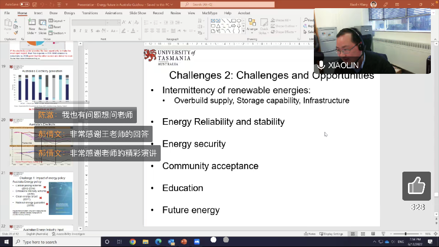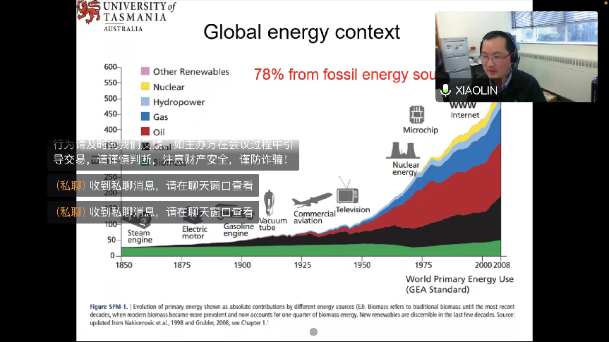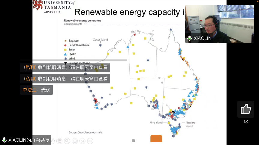 12月6日下午3:00,澳大利亚塔斯马尼亚大学王小林教授应邀参加我校350vip8888新葡的京集团文科讲坛,于腾讯会议做了题为“澳洲新能源利用现状和发展”的专题讲座。会议由350vip8888新葡的京集团李澄江副教授主持,管院部分教职工及全体研究生参会。