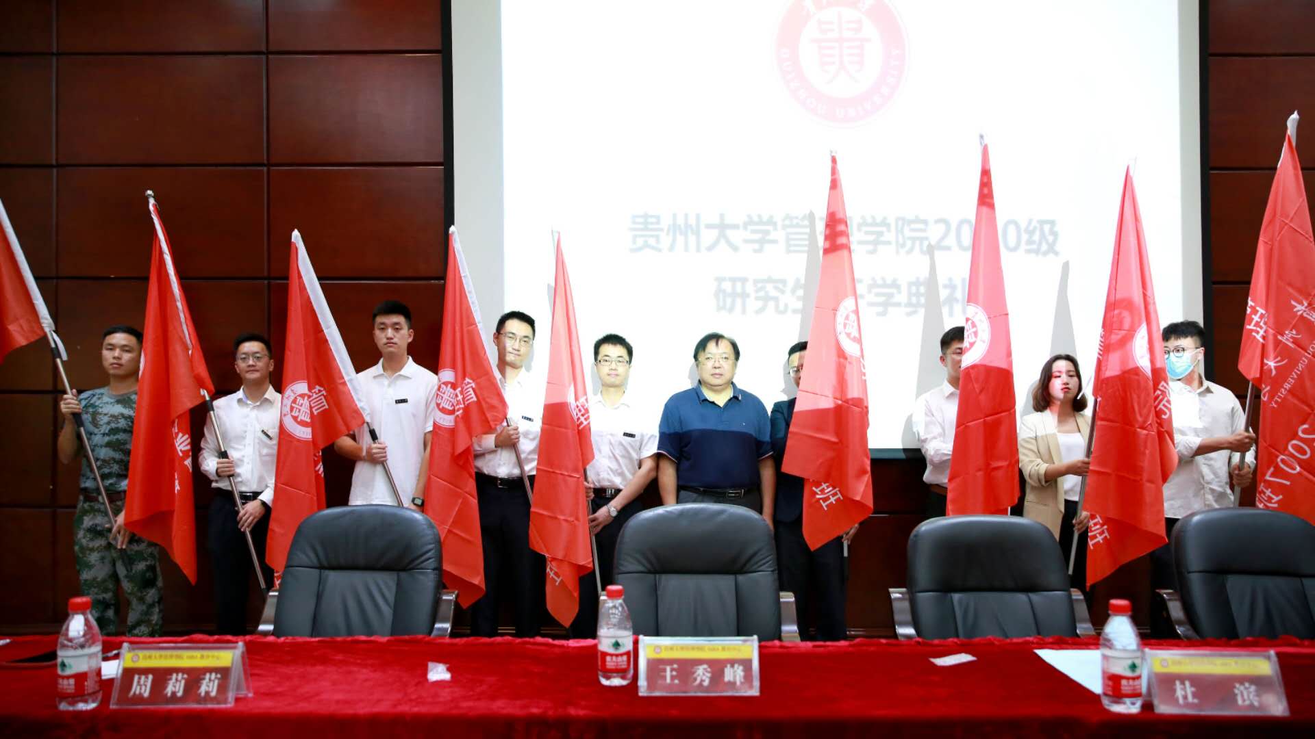 开学典礼由副院长周莉莉教授主持,研究生院院长杜滨教授、350vip8888新葡的京集团院长李烨教授分别致辞,MBA导师代表张莉副教授及2019级研究生老生代表何贤东进行了发言,最后在场领导为各班学生代表佩戴校徽,王秀峰教授郑重的将班旗授予了各个班级。
