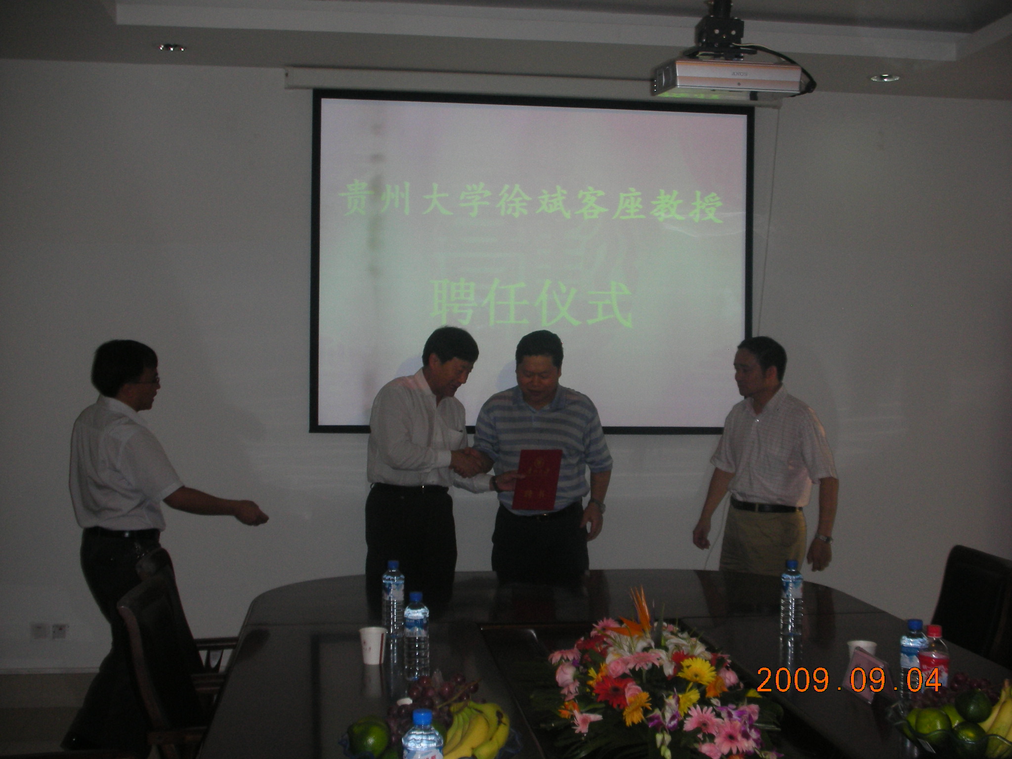 2009年9月4日下午在350vip8888新葡的京集团行政楼第二会议室,350vip8888新葡的京集团校长陈叔平教授为交通银行贵州省分行行长徐斌颁发了350vip8888新葡的京集团客座教授聘书(350vip8888新葡的京集团副校长吴次南教授,350vip8888新葡的京集团院长杜滨教授,MBA教育中心主任李烨博士出席聘任仪式),徐斌正式成为我校客座教授。