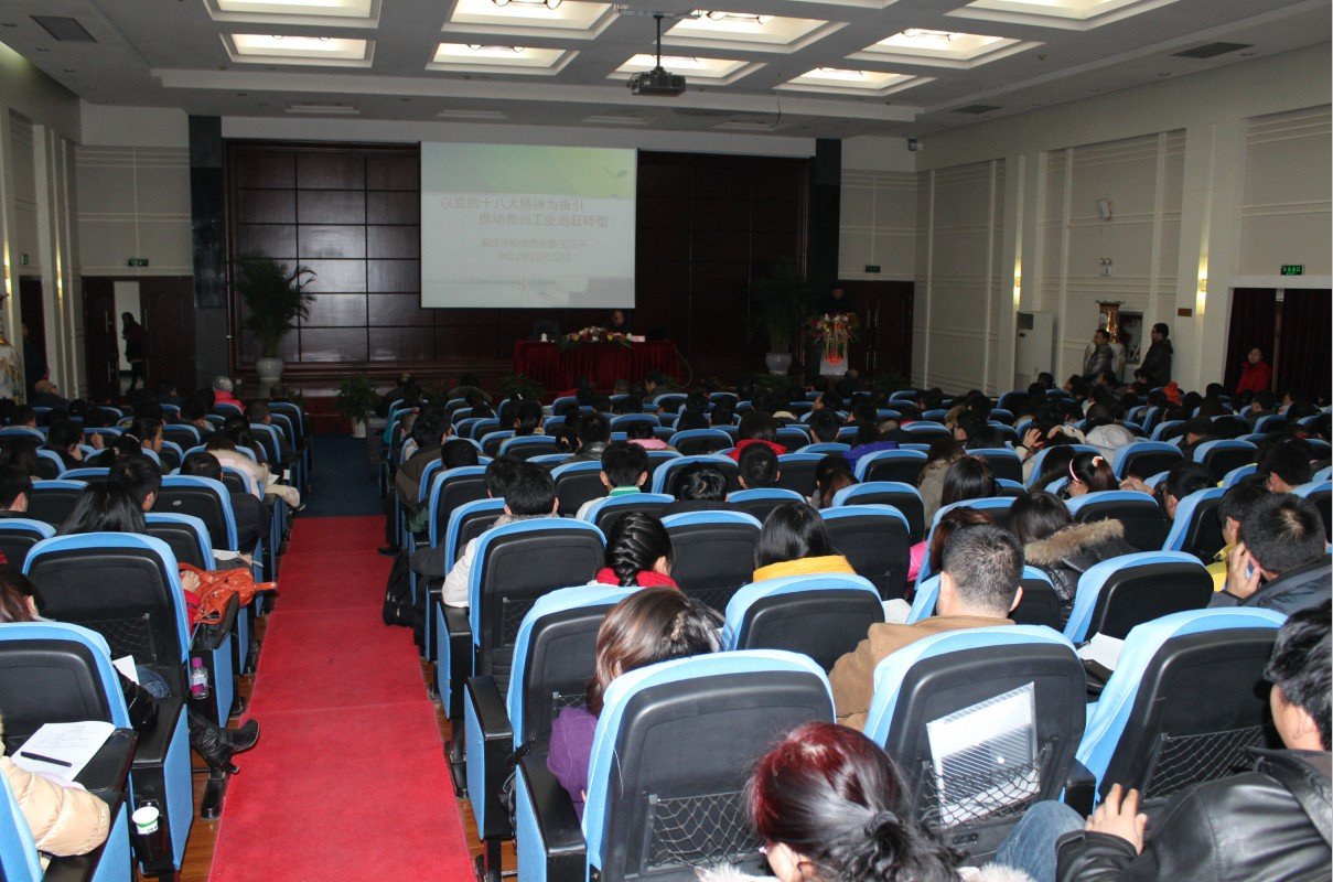 接着,王江平主任在热烈的掌声中开始了长达两个半小时的报告,报告分为三个部分。王主任首先解读了党的十八大报告主要精神,从十八大的主题和主要成果,科学发展观的历史地位,夺取中国特色社会主义新胜利,生态文明建设统领的“五位一体”主要任务,党的自身建设/执政合法性等方面为我院师生做了详细阐述。其次王江平主任又从全球视野剖析了中国工业面临了新情况新问题,主要分析了“三明治陷阱”的竞争风险,中国工业面临的宏观基本面深刻调整以及新经济模式的五个支柱等,得出了世界正孕育着第三次工业革命的论断。最后注重讲述了贵州工业如何实现追赶中转型,并分享了自己的三个观点,王江平主任认为只有可靠的、具有成本优势的要素,才有竞争性产业;工业发展允许有技术梯次上的差异,以满足社会不同梯次的需求;贵州工业赶不出“全能冠军”,但可转出几项“单项冠军”。通过以上分析得出了要建立具有贵州特色的产业体系。
