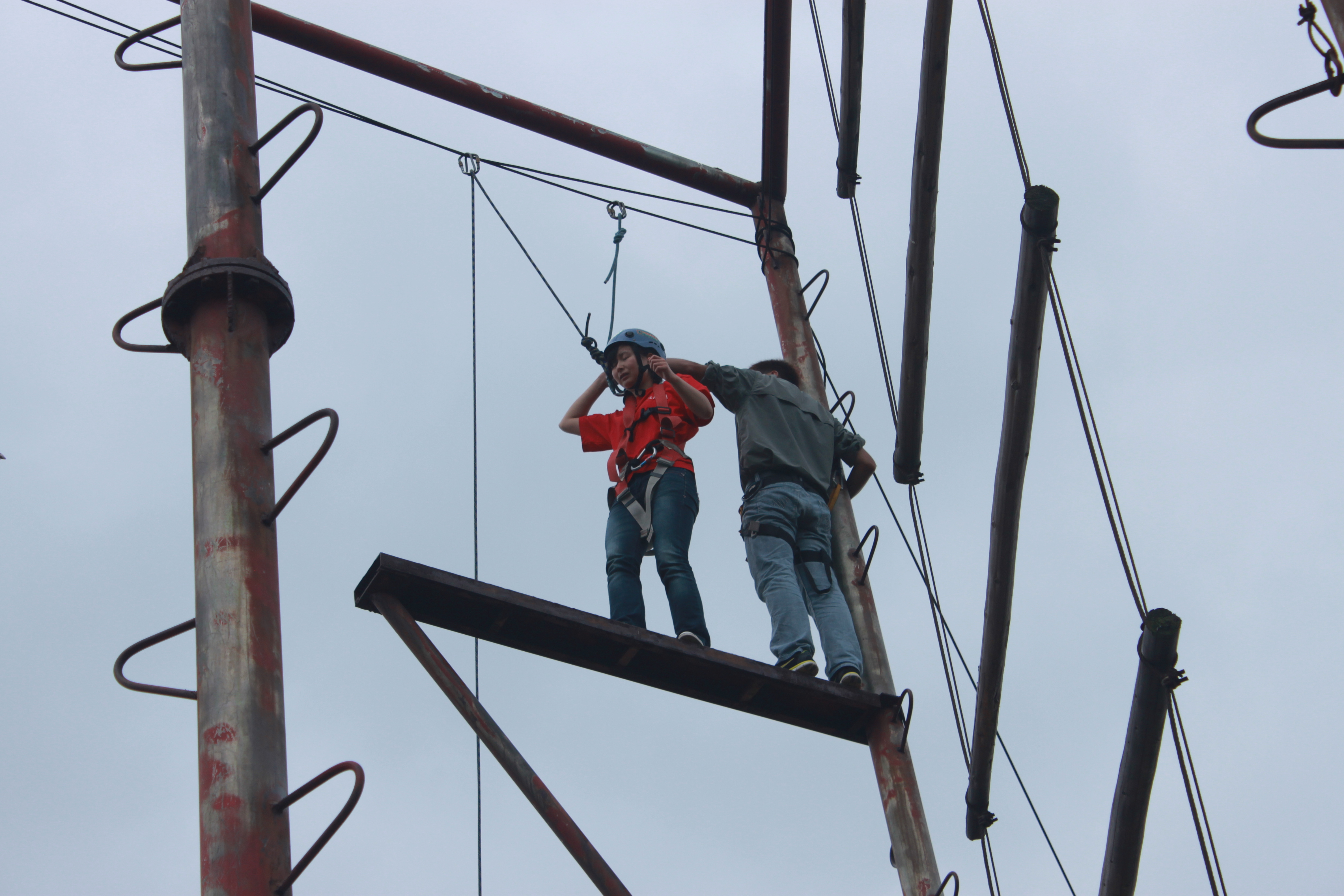 “穿越电网”项目则要求必须要有周密的计划、合理的分工、资源的有效整合与团队成员的精诚合作,才能将队友从那密密层层的电网中成功传送出去。“跳断桥”和“空中单杠”项目,需要同学们挑战自我。