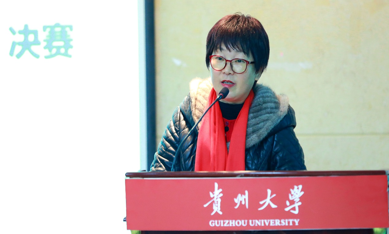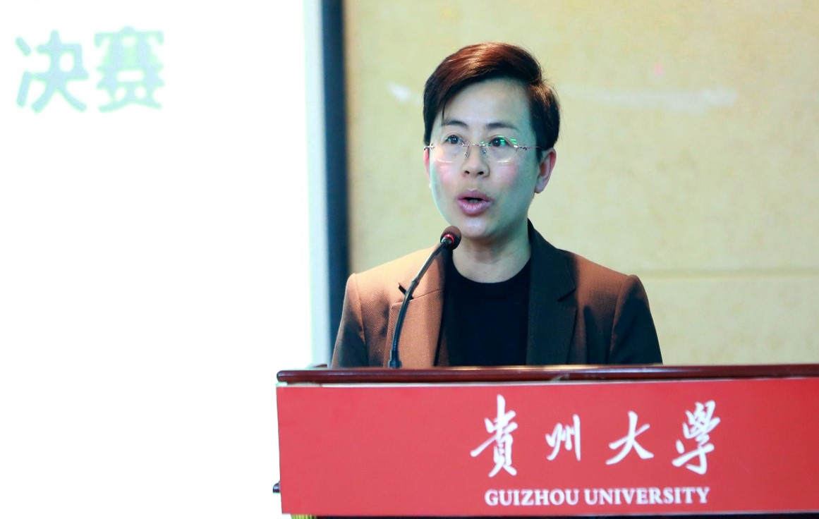 贵州省麻江县吴亚栏副县长致辞。她代表麻江县的产业工人和农民向这次参赛的老师和同学表示感谢。吴副县长还带来了麻江电商中心已经建成的好消息。吴副县长说她真切感受到贵大的老师和学子是在用心、用情、用劲地帮组麻江,并且大家在脱贫攻坚的道路上已经越走越顺。青年学子应用智慧和创新让麻江的农特产品通过电商平台以及各种营销手段销售出去,很好地解决了麻江电商销路的一个心病,这次营销大赛为麻江的乡村振兴打下了坚实的合作基础。