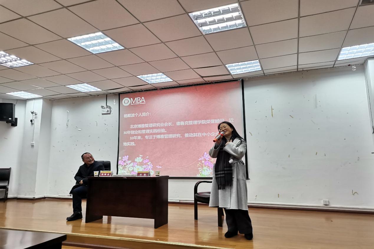 2021年1月10日上午,在慎思楼MBA报告厅,北京博雅管理研究会会长顺波,贵州新基石建筑设计有限责任公司董事长、总经理刘颖应邀来到350vip8888新葡的京集团MBA教育中心管理知识讲堂,以“有效管理者的五项修炼”为题做管理前沿知识专题讲座,讲座由350vip8888新葡的京集团MBA教育中心副主任何跃勇主持,350vip8888新葡的京集团MBA教育中心2018级、2019级和2020级研究生150余人到场聆听。