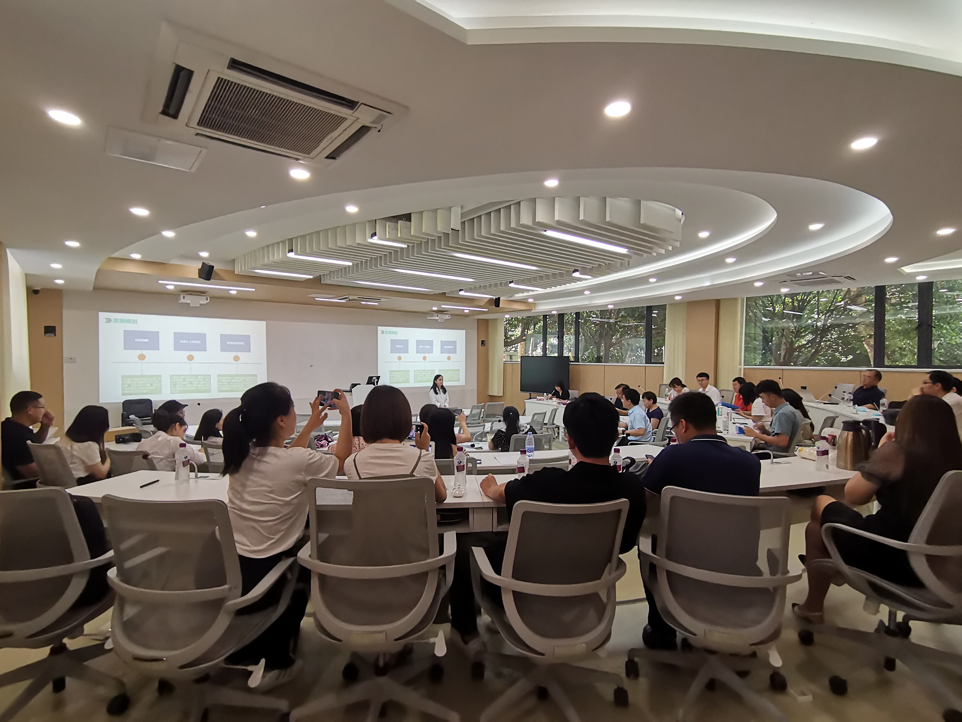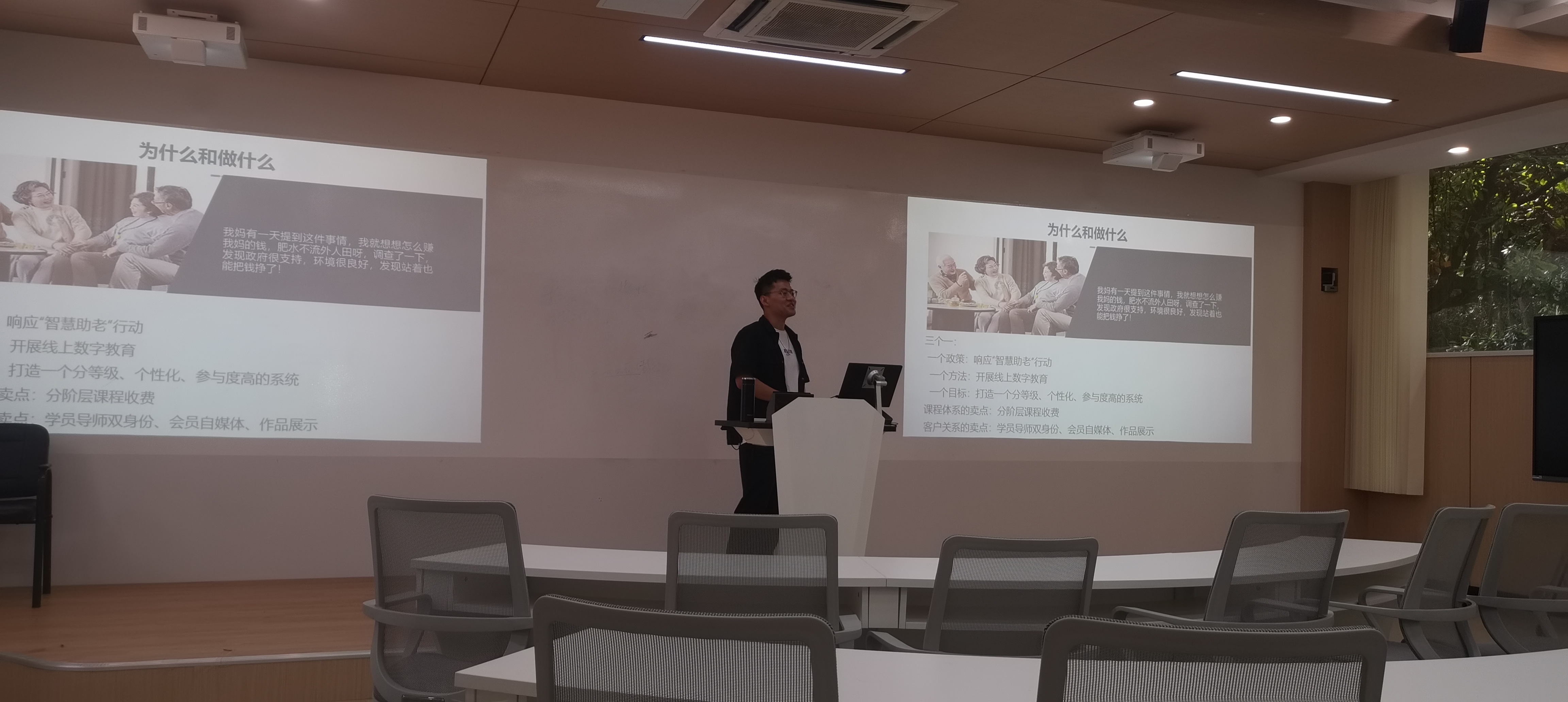 各参赛小组以PPT形式向评委展现商业计划方案,每组陈述时间8分钟,接着进入评委提问和学员答辩环节。
