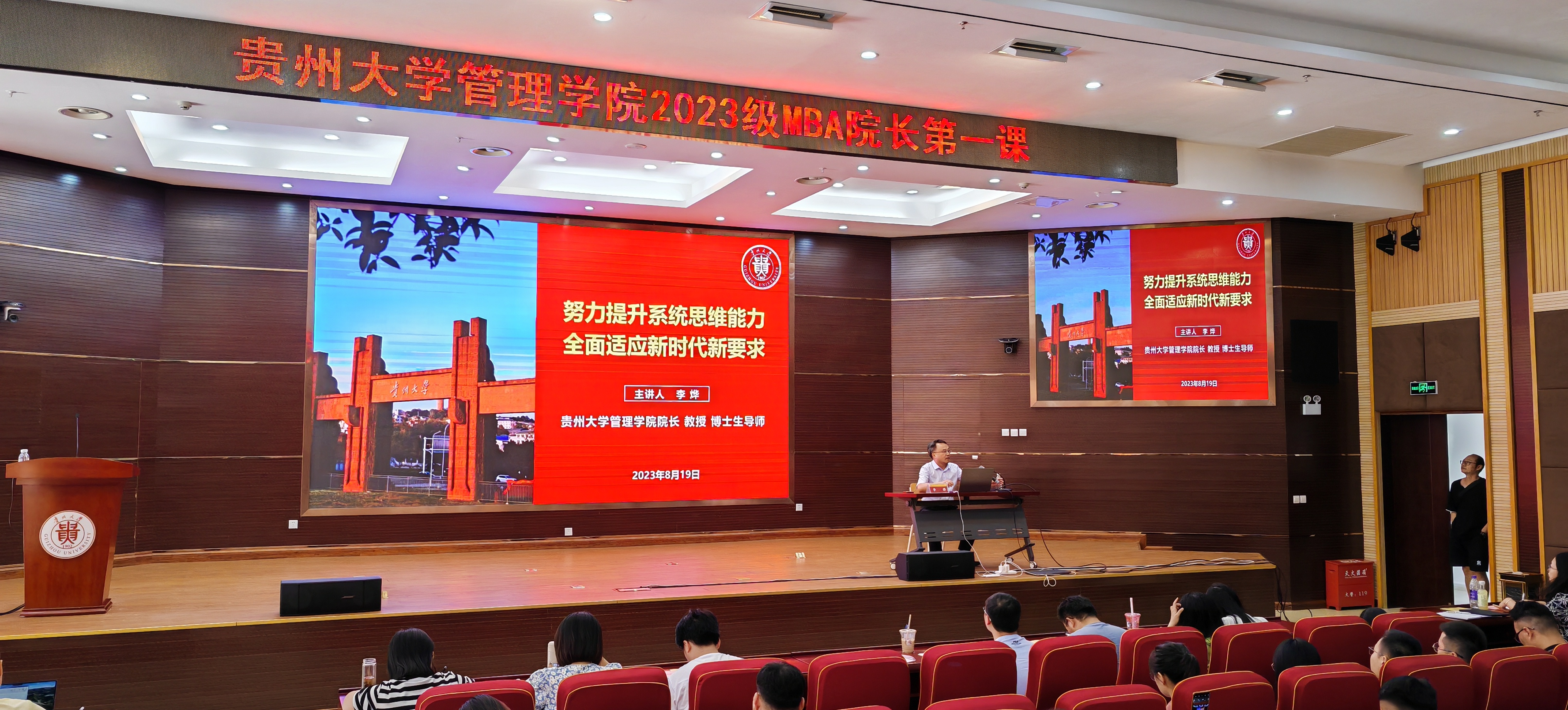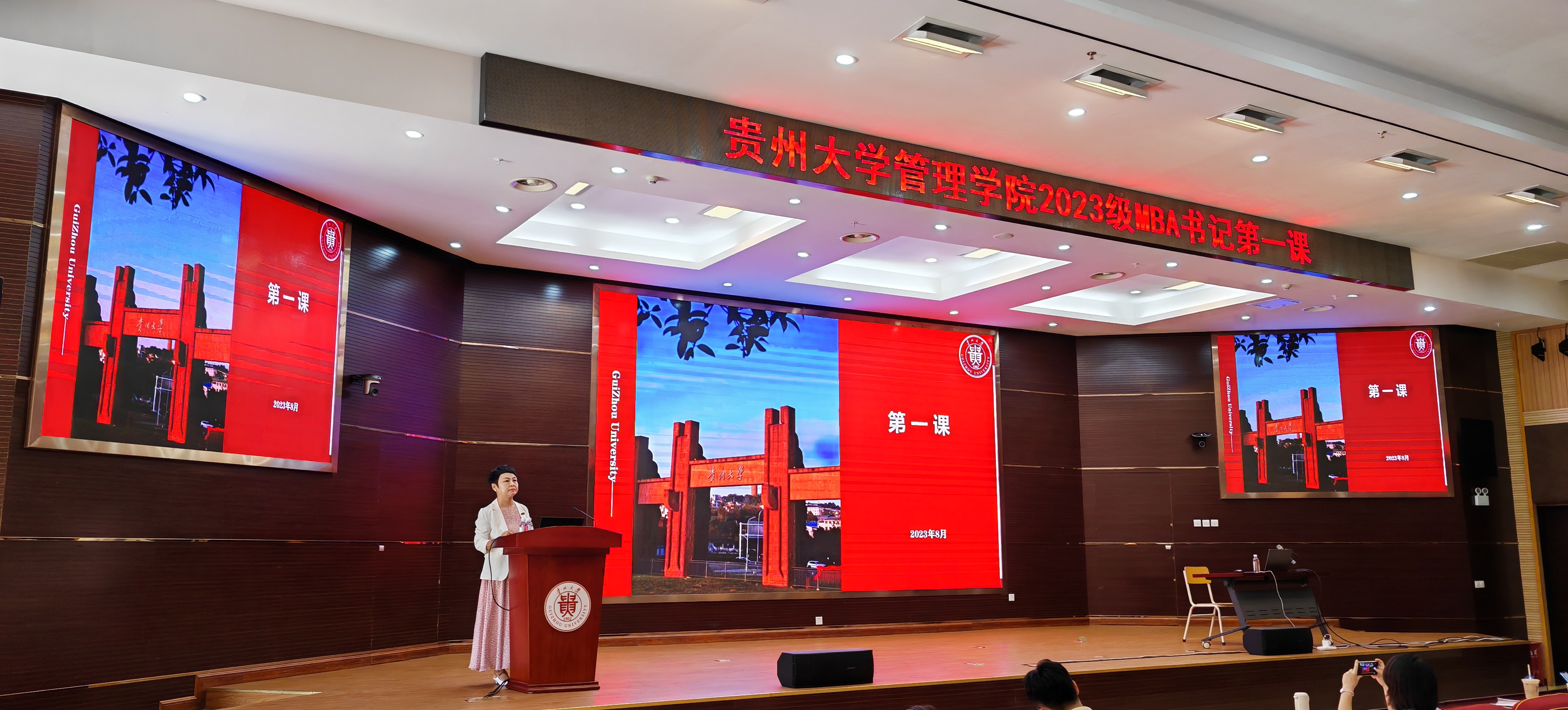 2023年8月19日下午,350vip8888新葡的京集团党委正处级组织员、350vip8888新葡的京集团党委副书记(主持党委工作)周莉莉教授为2023级MBA新生开启了书记第一课。周书记为新生详细介绍了贵州大学校史、350vip8888新葡的京集团发展史、MBA中心的发展历程及现状。